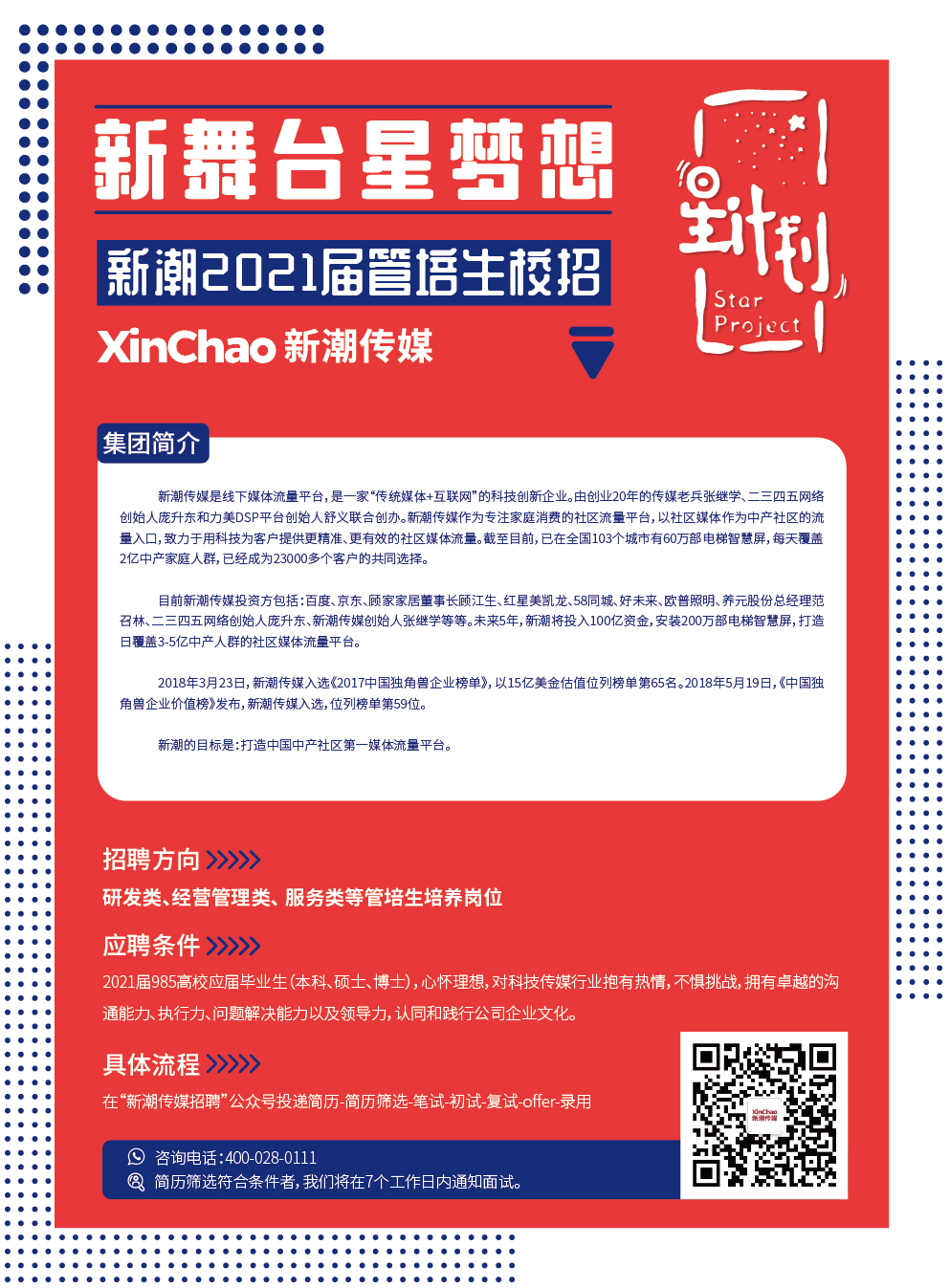 简历投递:XCHR@xinchao.com 官网咨询:www.xinchao.com 具体面试流程及面试时间请关注微信公众号:新潮传媒招聘
