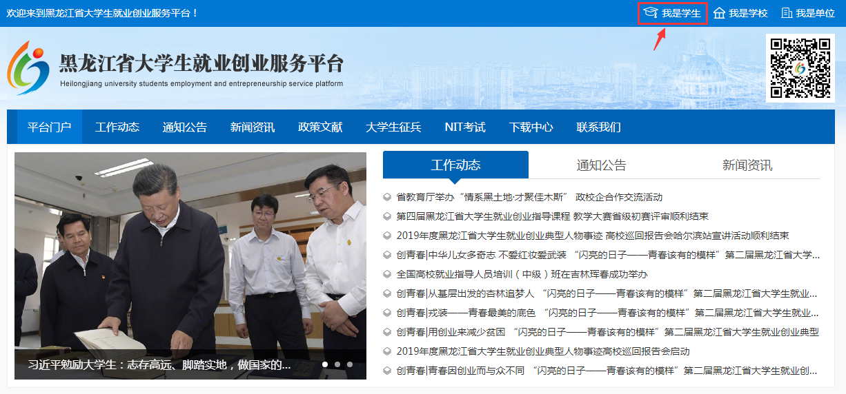 打开黑龙江省大学生就业创业服务平台,http:/(建议使用谷歌浏览器、火狐浏览器),点击【我是学生】,如下图所示: