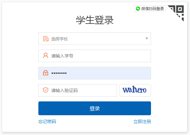 在登录页面点击【立即注册】按钮,进入学生注册页面,如下图所示: