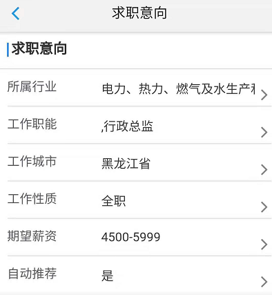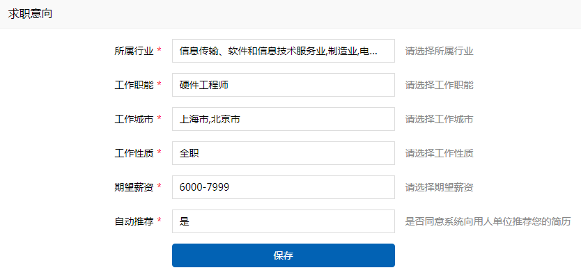 学生登录系统后,点击【求职意向】进行登记,登记后系统会自动和用人单位以及用人单位发布的岗位相匹配,匹配成功后会根据学生设置的意向向用人单位推送简历信息,如下图所示: