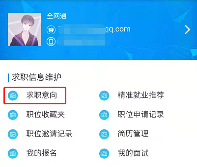 学生用户微信端进行求职意向登记,进入学生微信端个人中心,点击【求职意向】,可根据实际需求登记求职意向。如下图所示: