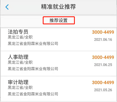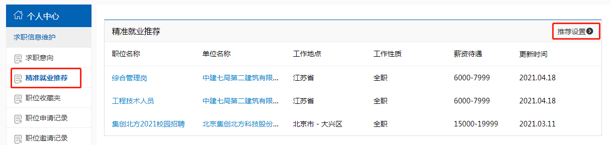 根据学生的推荐设置系统自动为学生匹配相应的职位信息,如下图所示: