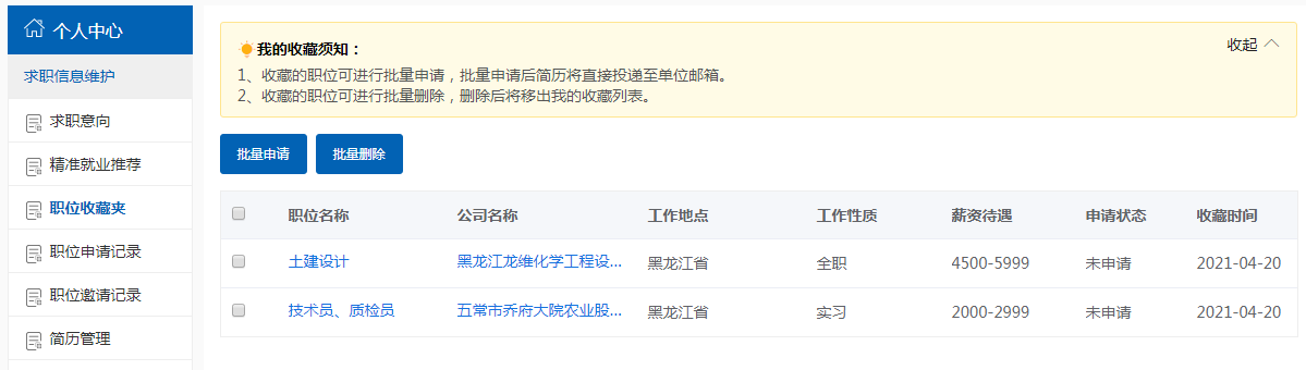 学生收藏过的职位,放置在此处维护。任一条打开后查看到该职位发布的详情。通过“申请职位”按钮操作,也可以批量申请已收藏的职位信息,如下图所示: