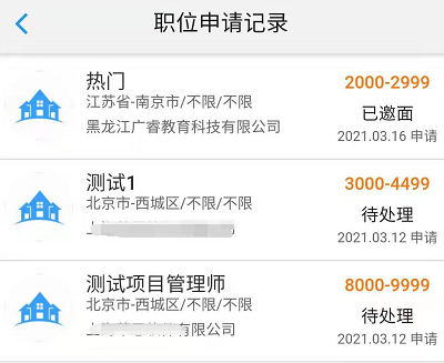 申请职位后,学生用户可以在微信端个人中心,查看职位申请记录,如下图所示: