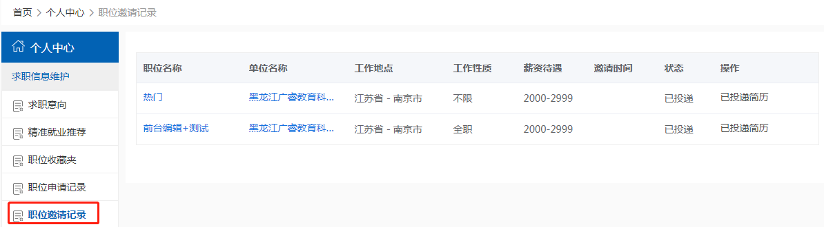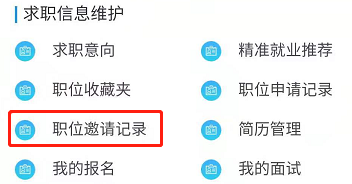 学生投递简历后用人单位可向学生发送面试邀请,点击【职位邀请记录】查看所有的职位邀请记录,如下图所示: