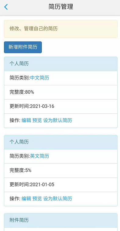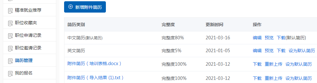 在系统内投递出的简历皆以此为准。学生可对两份简历进行编辑、预览、下载、设为默认简历等操作,附件简历可以为学生自己制作简历并上传,系统默认完整度为100%。
