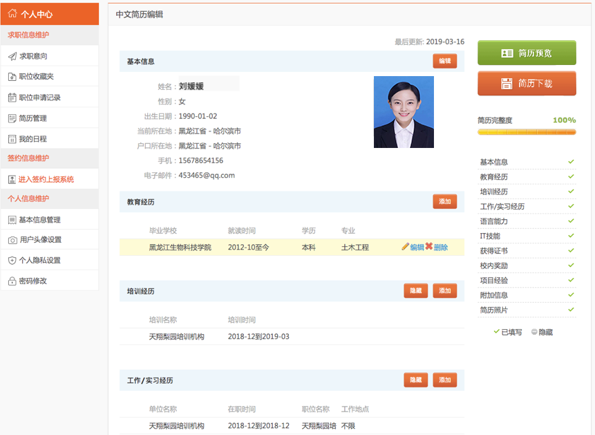 点击【编辑】按钮,进入简历详情,学生依次可对基本信息、教育经历、工作实习经历、培训经历等内容进行编辑,系统会实时监测简历完善程度(要求完整度达到80%,否则无法投递简历),如下图所示: