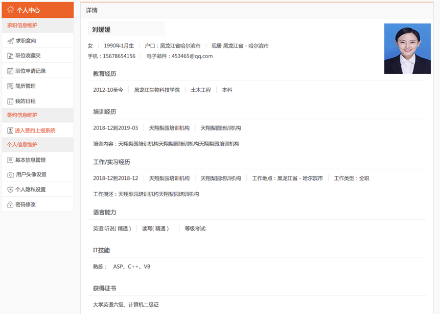 简历预览,则学生以查看简历的形式预览简历,如下图所示。