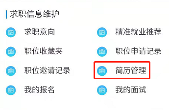 学生用户微信端进行简历查看和编辑,进入学生微信端个人中心,点击【中文简历管理】或【英文简历管理】,编辑或预览本人简历。如下图所示: