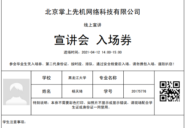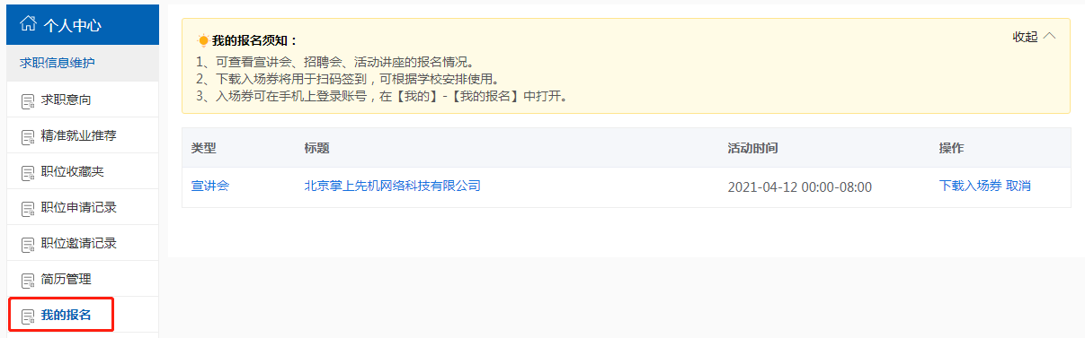 如报名参加线下的宣讲会、招聘会可根据实际需求下载入场券,用于扫码签到,如下图所示: