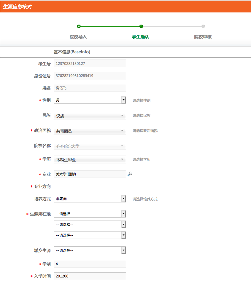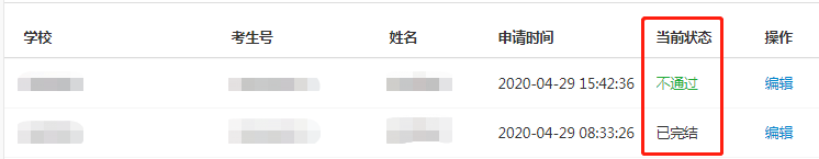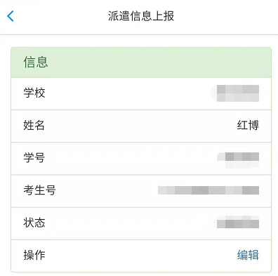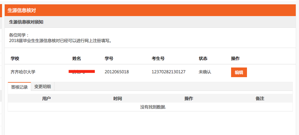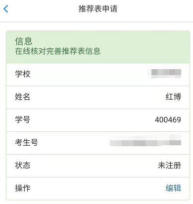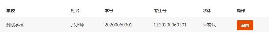 当看到状态是“未确认”时,学生即可完善生源信息并提交送审。点击右侧的【编辑】按钮进入详情。如下图所示: