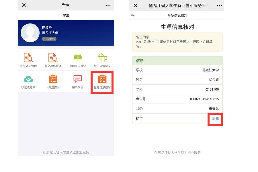 学生用户微信端进行生源信息核对,进入学生微信端个人中心,第一步,点击【生源信息核对】。第二步,点击【编辑】,如下图所示: