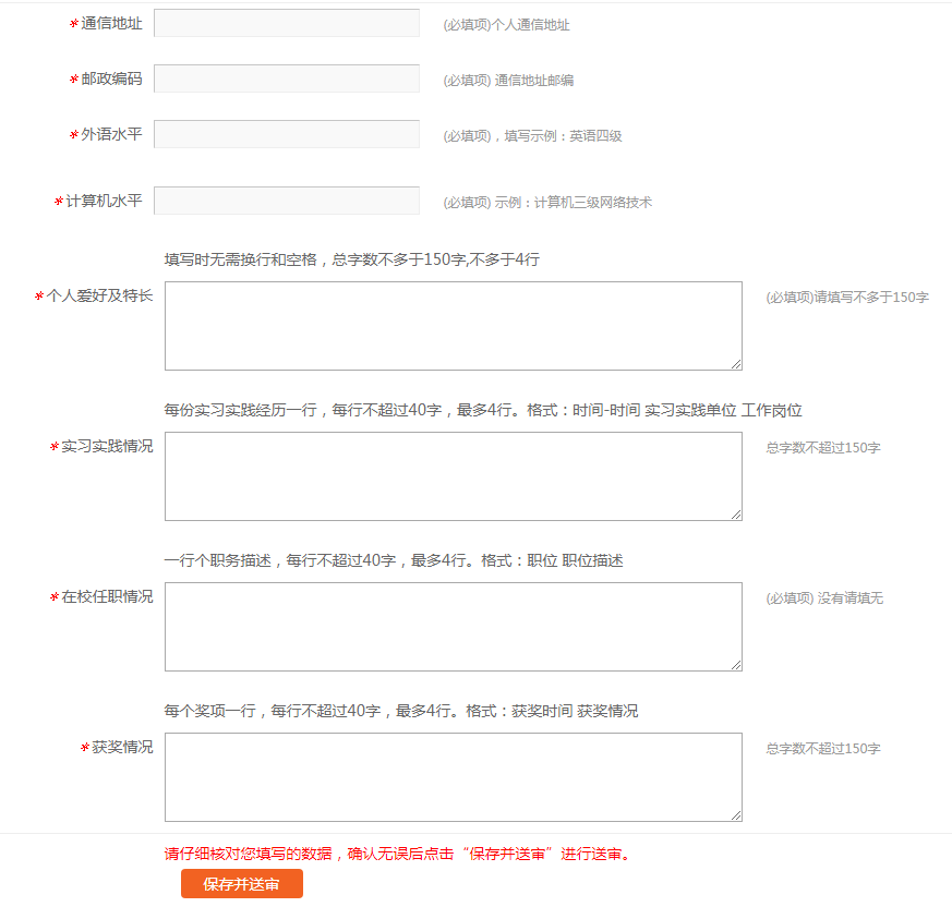 第三步,按要求仔细填写完善信息,点击页面最下方【保存并送审】,等待学校进行核对,如下图所示: