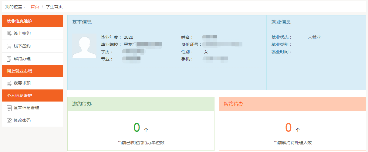 (4)解约待办:展示网上签约完成后,学生/用人单位向对方发起解约申请,等待另一方进行解约处理的信息。