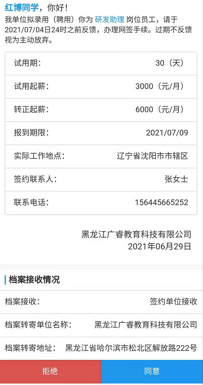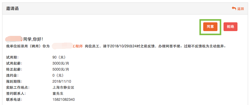 若同意与用人单位签约,则点击【同意】按钮,若拒绝与用人单位签约,则在邀请函里点击【拒绝】按钮,此次签约已拒绝。学生可继续同其他用人单位签约,如下图所示: