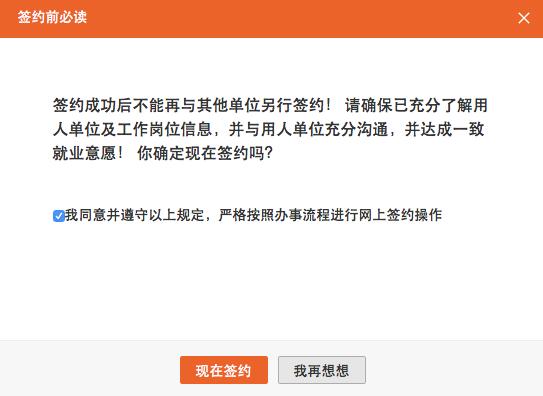 同意签约需二次确认,在弹出框中点击【现在签约】,则学生与用人单位达成签约意向,如下图所示: