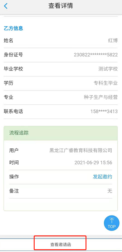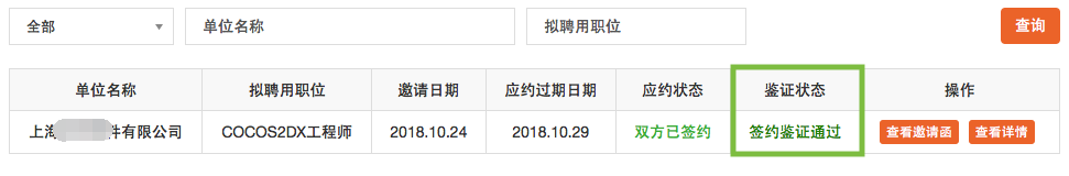点击“单位名称”-【查看邀请函】,可以与用人单位进行签约,如下图所示: