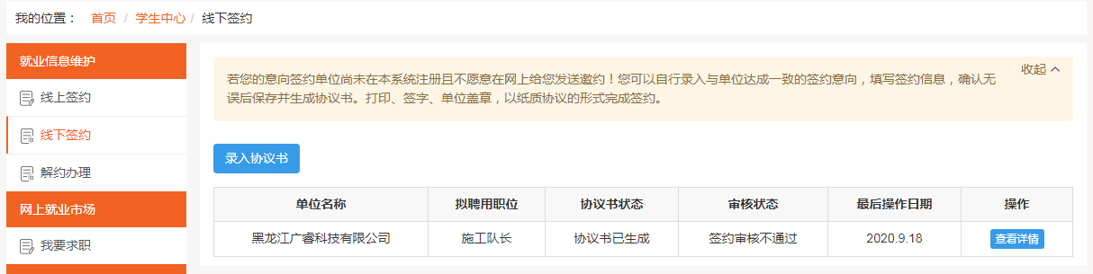 学校审核不通过,学生可点击【查看详情】查看审核不通过的原因,可以再次提交线下签约申请,如下图所示: