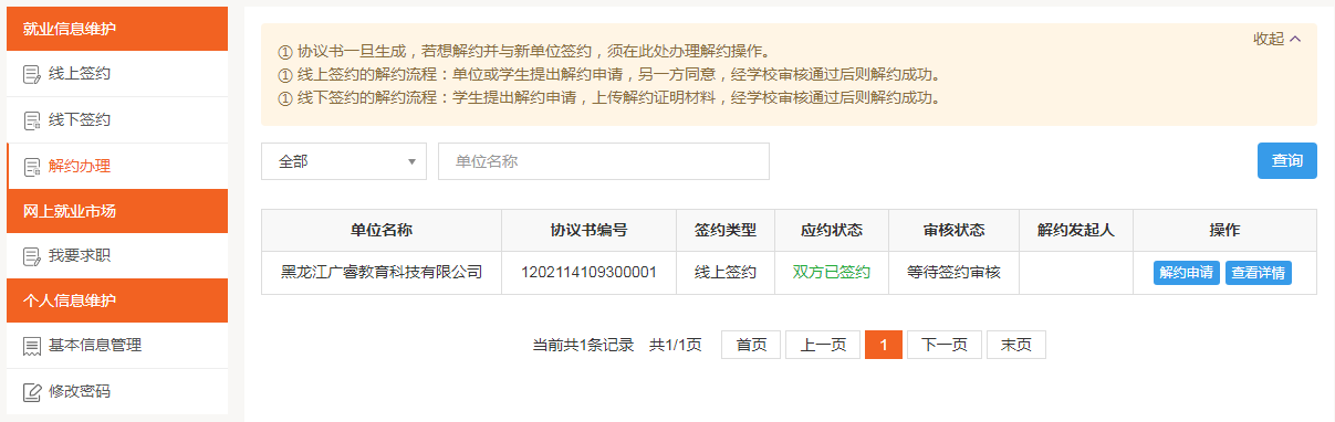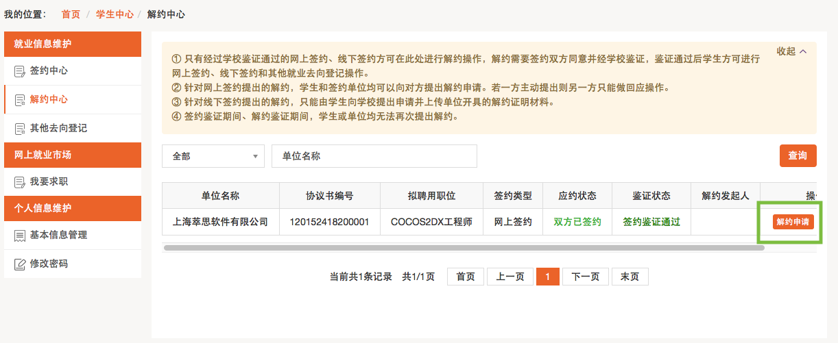 学生在解约办理模块可以看到当前签约(线上签约、线下签约)已审核通过的信息,通过条目右侧的“解约申请”按钮进行解约操作,如下图所示: