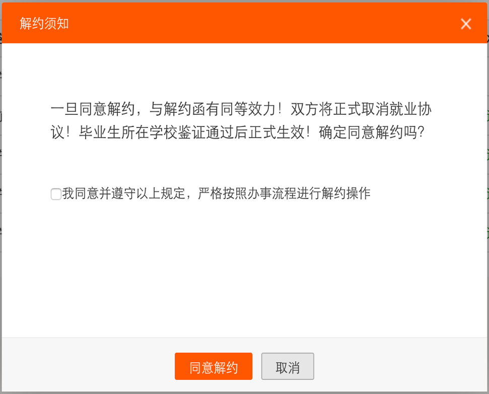 学生在充分了解到用人单位的解约理由,并确认同意解约须知后,即可点击解约【同意】按钮,即达成解约意向,等待学校老师审核,如下图所示: