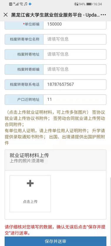 根据页面字段信息填写就业信息上报,点击【保存并送审】即可提交,如下图所示: