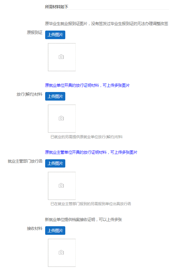 在提交申请的同时,请将报到证原件、解约手续原件、新单位接收手续原件寄至毕业学校就业工作部门方能办理(受新冠肺炎疫情影响,2019届和2020届毕业生就业改派时限调整为自毕业之日起两年内)。