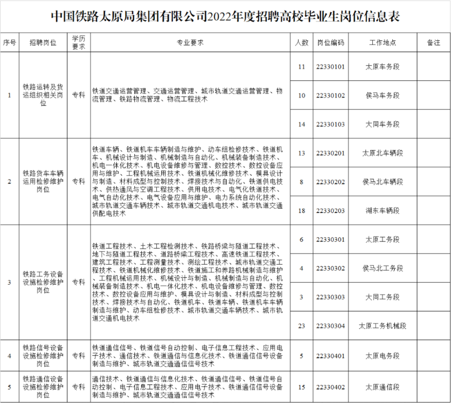招聘岗位、学历、专业、人数和工作单位等内容详见《中国铁路大原局集团有限公司2022年度招聘高校毕业生岗位信息表》。