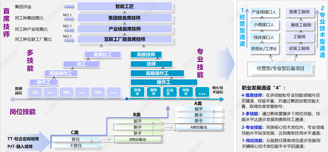 2”:经营型通道和专业技术型通道;从操作类到专业技术专家及核心管理层发展通道;