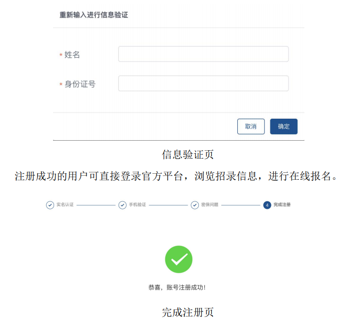招录对象网上报名前需进行注册,注册时需认真阅读《注册指南》(阅读时间不少于20秒)。点击【开始注册】按钮进入注册界面,首先需进行实名认证,身份证号将作为报名系统的登录账号。