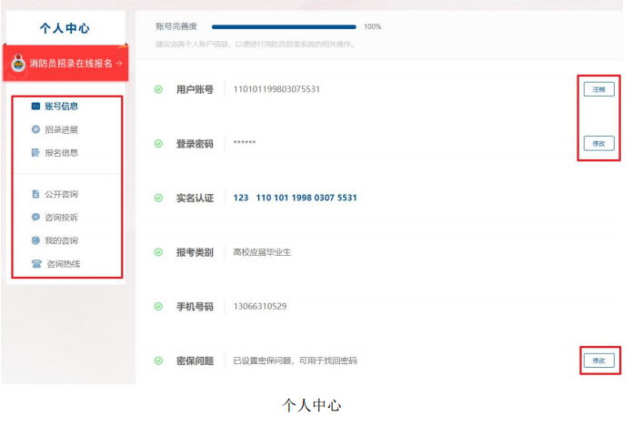 用户登录后,可通过点击网页右上角【姓名】进入个人中心。在个人中心可维护账号信息、查看招录进展、编辑报名信息和提交咨询投诉,报名信息提交前,招录对象如有发现注册信息中身份证号及报考类别填写有误的,可点击用户账号后的【注销】按钮自行注销当前账号后重新注册;报名信息提交后,招录对象不可自行注销;报名信息提交前,招录对象如有发现姓名或身份证正反面照片有误的,可点击实名认证后的【修改】按钮进行修改;报名信息提交后,如需修改姓名或身份证正反面照片需点击实名认证后的【申请修改】按钮进行申请,管理员审批通过后方可修改。