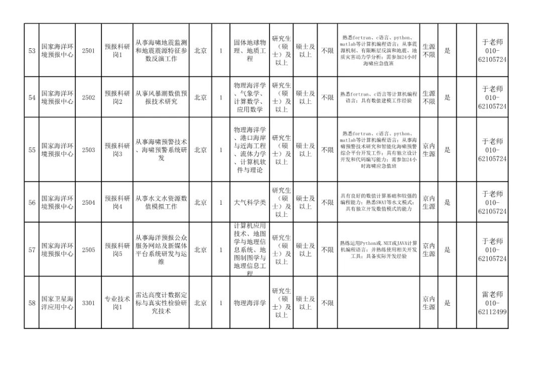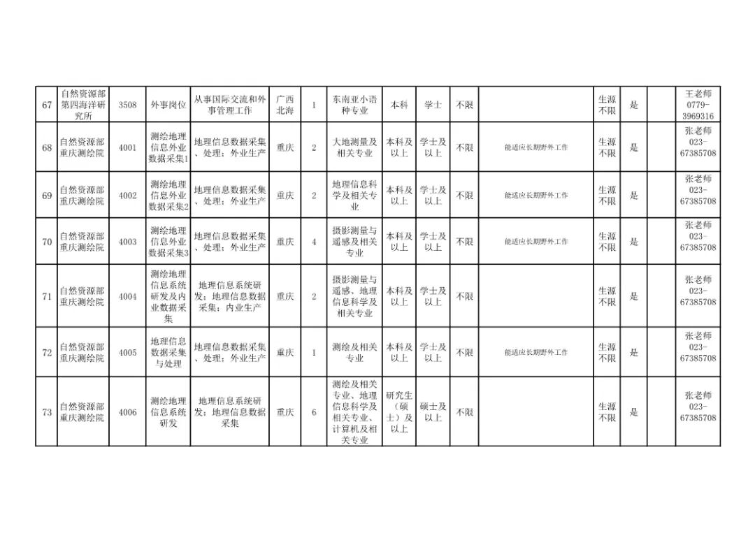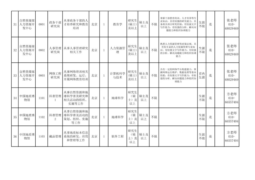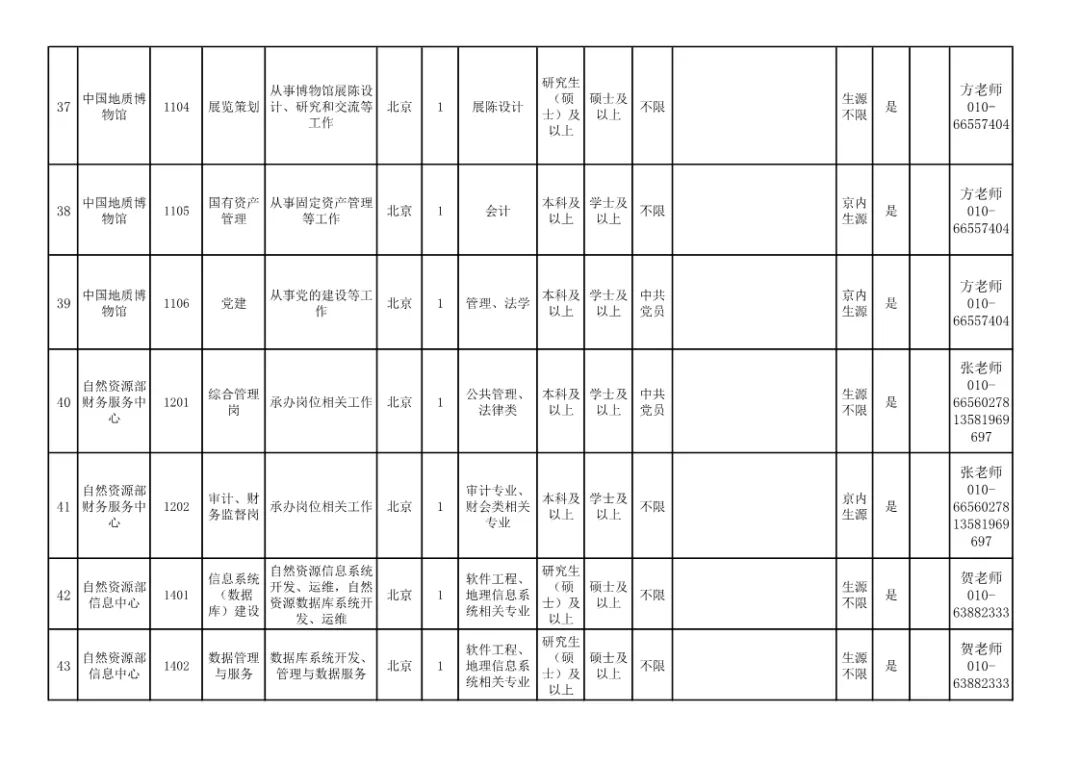(三)热爱自然资源事业,具有较强的事业心和责任感,爱岗敬业,具有良好的奉献精神和团队协作精神。 (四)年满18周岁,大学本科不超过24周岁(1996年1月1日后出生)、硕士研究生不超过27周岁(1993年1月1日后出生)、博士研究生不超过35周岁(1985年1月1日后出生)。须在国家规定的时限内取得相应的学历学位证书。不符合以上条件的,招聘单位可以取消其聘用资格。(五)具备与招聘岗位相匹配的专业、技能等条件和身体、心理素质。(六)符合国家有关部门或招聘单位驻地关于接收非本地生源毕业生的有关规定。京内生源是指入学前具有北京市常住户口的高校毕业生。(三)曾在各级公职人员招考中被认定有舞弊等严重违反考试录用纪律行为的。1、报名时间: 2020年3月31日—4月13日,4月13日23点之后不再接受报名。2、报名方式:请于报名期限内登录“自然资源部直属企事业单位2020年度公开招聘高校应届毕业生网上报名系统”(网址:http://recruitment.nmdis.org.cn),仔细阅读注意事项,按照系统要求浏览招考岗位并选择报名。应聘人员报名后,招聘单位按照岗位要求进行资格审查(岗位具体要求以招聘单位的解释为准)。经资格审查符合要求的,信息系统将显示为审核通过。资格审查未通过的应聘人员,可在报名期限内再次申报其他岗位。招聘单位将在本单位门户网站发布资格审查最终结果。本次公开招聘进行统一笔试,统一笔试科目包括职业能力测试和申论。资格审查通过的应聘人员方可参加统一笔试。招聘岗位为专业技术岗位且学历学位条件仅限定为博士研究生的,应聘人员是否参加统一笔试由招聘单位研究确定。统一笔试时间、地点等视新冠肺炎疫情防控情况另行通知。如组织统一笔试,按照招聘岗位面试人员计划总量的1.2倍确定笔试合格分数线,参加笔试的应聘人员成绩合格方可进入面试。各招聘岗位按照1∶5的比例和笔试成绩由高到低的顺序确定参加面试人员。进入面试人选少于规定比例人数的,按照实际人数进行面试,不进行递补和调剂。各招聘单位将在自然资源部门户网站以及本单位门户网站发布面试人员名单和面试安排。如因新冠肺炎疫情防控需要取消统一笔试,面试规则及安排另行通知。面试成绩不低于60分的应聘人员方可被确定为考察对象。各招聘岗位实行等额考察,招聘单位按照应聘人员的综合成绩由高到低确定体检和考察人选,组织体检和考察。拟聘人选名单在中央和国家机关所属事业单位公开招聘服务平台、自然资源部门户网站以及招聘单位门户网站进行公示。(一)每名应聘人员只能选择报考1个岗位,通过资格审核的,不允许更改报考岗位;未通过资格审核的,可再次申报1个岗位。(二)应聘人员提交的报考信息及材料应确保真实、准确。未认真填报造成信息不全、有误的,由应聘人员承担责任;凡弄虚作假者,一经查实,将被取消考试和录用资格。(三)请密切关注中央和国家机关所属事业单位公开招聘服务平台、自然资源部门户网站、招聘单位门户网站以及“自然资源部直属企事业单位2020年度公开招聘高校应届毕业生网上报名系统”,及时掌握有关信息。