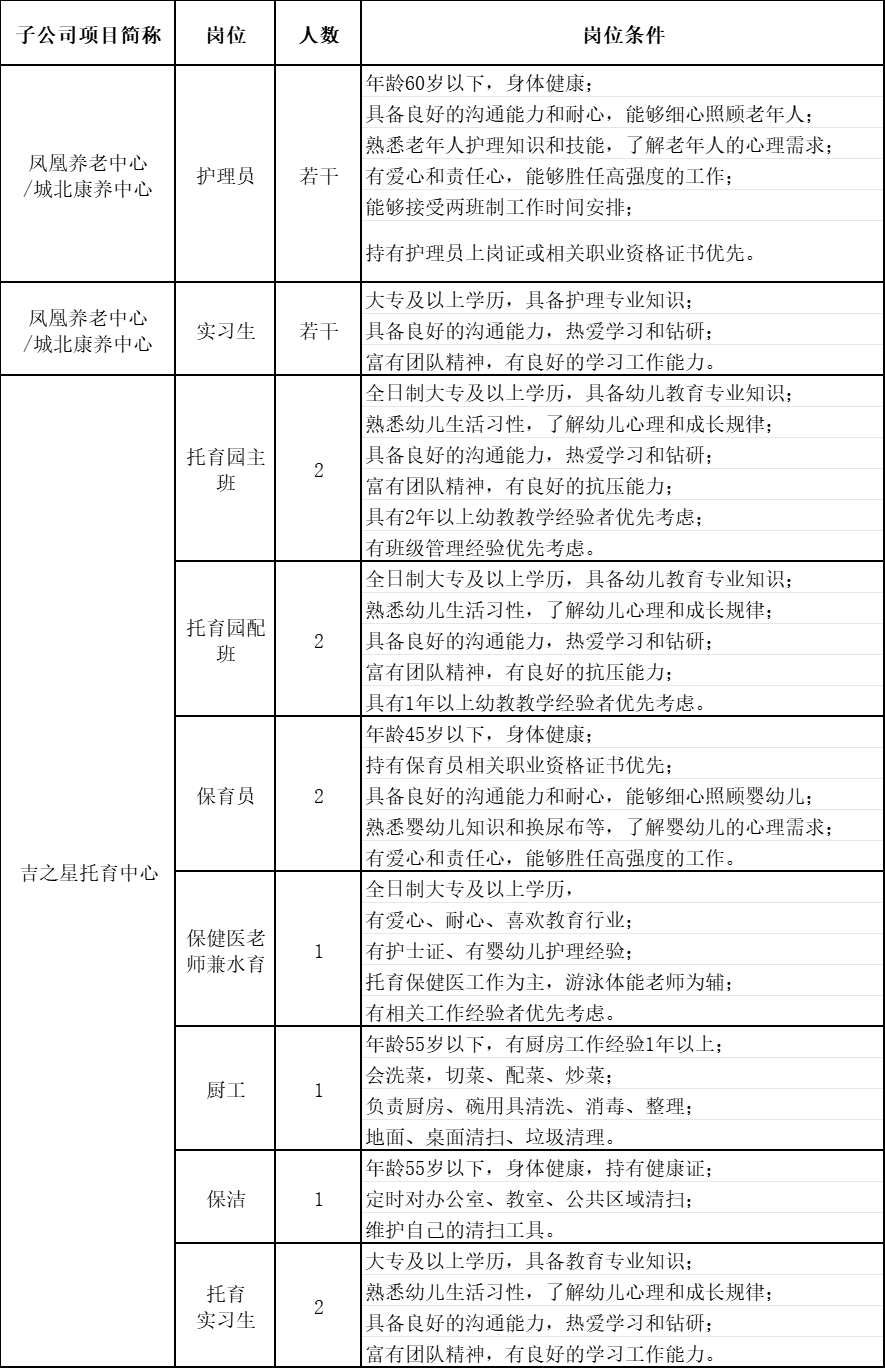 吉安城投康养公司作为吉安城投公司全资子公司,以一老一小为服务主体,打造多元化、高品质的康养产业集群。为民众提供全生命周期的健康服务。因各子公司项目工作需要,经公司研究吉安吉星养老服务有限公司、吉安吉之慧托育服务有限公司,决定面向社会招聘相关人员,现将有关事项公告如下: