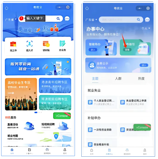 微信搜索“粤就业”小程序或通过“粤省事”→“就业”板块进入