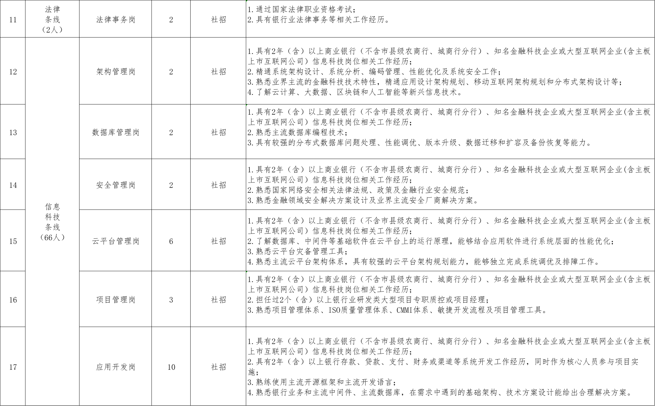 5.社会招聘人员须为统招大学本科及以上学历,年龄在40周岁以下(1985年4月30日后出生),信息科技条线岗位招聘人员年龄可放宽至45周岁以下(1980年4月30日后出生)。