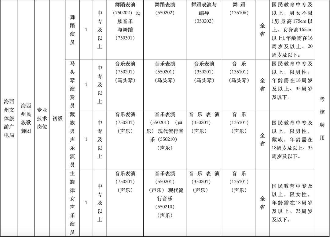 海西州民族歌舞团 招聘工作人员公告 根据《青海省事业单位公开招聘工作人员办法》(青人社厅发〔2015〕80号)、《关于进一步加强和规范全省事业单位公开招聘工作的实施意见》(青人社厅发〔2018〕2号)等政策规定,结合海西州民族歌舞团用人需求,拟面向社会公开招聘4名事业单位工作人员,现将有关事项公告如下: 一、招聘岗位、范围和条件 (一)招聘岗位 考核招聘舞蹈演员1名,马头琴演奏员1名,声乐演员2名(藏族男声乐演员1名,主旋律女声乐演员1名)。具体招聘岗位和人数详见《海西州民族歌舞团面向社会公开考核招聘事业单位工作人员计划表》(详见附表)。 (二)招聘范围 本次公开招聘面向全省符合岗位资格条件的应、往届大中专毕业生及以上。 (三)招聘条件 1.具有中华人民共和国国籍; 2.遵守宪法和法律; 3.具有良好的品行; 4.岗位所需的专业或技能条件; 5.适应岗位要求的身体条件; 6.岗位所需要的其他条件。 (四)不予报考情形 曾因犯罪受过刑事处罚的;曾被开除中国共产党党籍、公职的;正在接受纪检监察和司法机关立案审查调查的;受到党纪政务处分并正在处分期内的;在事业单位公开招聘和公务员考录中被记入诚信档案库且在有效记录期内的;被依法列为失信联合惩戒对象的;在读的非2025年应届毕业生;法律法规以及国家和我省规定不宜聘用的其他情形。 二、招聘程序 招聘工作按照发布招聘信息、现场报名和现场资格审查、考核、体检、考察(政审)、公示、办理聘用手续等程序依次进行。 此次公开考核招聘报名工作采取现场报名和现场资格审查方式进行。现场报名时间及现场资格审查时间:2025年6月3日-2025年6月5日。现场报名时考生须提交本人有效二代身份证(有效期内的临时身份证或由户籍部门出具的带照片的加盖户籍专用章的户籍证明)、户口簿、毕业证、在教育部“学信网”打印的学历验证报告以及报考岗位所需有关材料的原件及复印件,机关事业单位在职人员报考的还需提供同意报考证明。毕业证书遗失的,考核前应提供学校学籍管理部门出具的相关证明材料;无法在“学信网”查询学历(中专)验证报告的,需提供与毕业证相符的由学校出具盖章的学籍证明。考生提供的信息和材料必须真实有效,凡不提交或弄虚作假的,即取消其聘用资格。(报名所需资料均为一式三份)。 三、招聘考核内容 通过资格审核后的考生,进行基本素质面试、专业技能展示2部分组成,主要考核应聘人员专业实践技能操作,总分100分,设最低分数线80分(含80分),考核成绩保留到小数点后两位,按考核最终分数从高到低择优聘用。具体考核时间和地点另行通知。 (一)舞蹈演员岗位 1.基本素质面试(分值20分) (1)形象分数:10分 (2)表达分数:10分(朗诵,题材、内容自选,限时2分钟) 2.专业技能展示(80分) (1)个人技巧展示:30分(展示个人技巧,限时2分钟) (2)自选舞蹈表演:30分(3分钟内完成一段自选舞蹈内容的表演,需自带MP3格式伴奏,限时3分钟) (3)即兴舞蹈表演:20分(随机抽取曲目,由工作人员播放一遍,考生准备1分钟后随着音乐自编一段舞蹈进行即兴表演,限时2分钟) (二)声乐演员岗位 1.基本素质面试(分值20分) (1)形象分数:10分 (2)表达分数:10分(朗诵,题材、内容自选,限时2分钟) 2.专业技能展示(80分) (1)音乐素质:20分(乐感好、口齿清晰、嗓音本质好,掌握一定的演唱技能) (2)曲目演唱:50分(准备2首歌曲,创作歌曲、中外艺术歌曲均可;藏族男歌手藏语、汉语演唱各1首;主旋律女歌手清唱1首、带伴奏演唱1首) (3)乐理、视唱练耳:10分(乐理视唱根据简谱或线谱现场抽签应试,练耳根据现场钢琴弹奏听音) (三)马头琴演奏员岗位 1.基本素质面试(分值20分) (1)形象分数:10分 (2)表达分数:(10分朗诵,题材、内容自选,限时2分钟) 2.专业技能展示(80分) (1)视奏:20分 (2)乐理、视唱练耳:20分(乐理视唱根据简谱或线谱现场抽签应试,练耳根据现场钢琴弹奏听音) (3)作品演奏:40分(中高难度曲目1首、练习曲1首) (四)体检 根据最终成绩排名,按照考生与岗位1:1的比例,择优确定体检和考察人选。确定人选的最终成绩应达到80分(含)以上,未达到分数应聘人员不予进入体检环节。体检由海西州文体旅游广电局负责组织。体检标准参照《公务员录用体检通用标准(试行)》《公务员录用体检操作手册(试行)》执行。应聘人员在体检过程中,有意隐瞒影响聘用的疾病或病史的,一经发现,取消聘用资格;有串通体检工作人员或者请他人顶替以及交换、替换化验样本等作弊行为的,应聘人员体检结果无效并不予聘用。因个人原因未按要求参加体检的考生,视为自动放弃。体检不合格者,经本人申请,由海西州文体旅游广电局组织复查一次,仍不合格者,取消进入考察资格。 (五)考察(政审) 对体检合格人员进行考察(政审),考察(政审)要始终坚持把政治标准放在首位,除对考生基本的政治条件、遵纪守法、职业素质、个人诚信情况、个人档案审查外,要突出考生在反分裂反渗透斗争中的政治态度、政治立场、政治表现的考察。根据有关规定,组织政审时还要对考生的个人档案情况按有关规定进行严格审核,凡考生个人诚信、个人档案等违反国家和我省相关规定的,按规定进行相应处理。政审不合格的考生,取消招聘资格。 (六)公示聘用 根据考核、体检和考察结果,确定拟聘用人员名单。拟聘用人员名单将在青海省人事考试