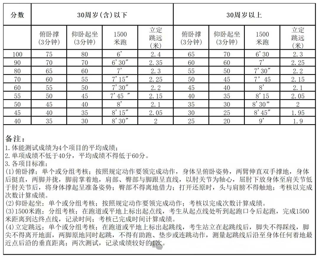 3.体能测试的测试科目为:1500米跑、仰卧起坐、俯卧撑、立定跳远。单项成绩低于40分,平均成绩低于60分不予录用。根据拟录用人数1:3的比例,从高分到低分确定进入面试人员(最后一名分数并列者均参加体能测试),如达不到招聘比例要求,以实际体能测试合格人员作为进入面试人员。