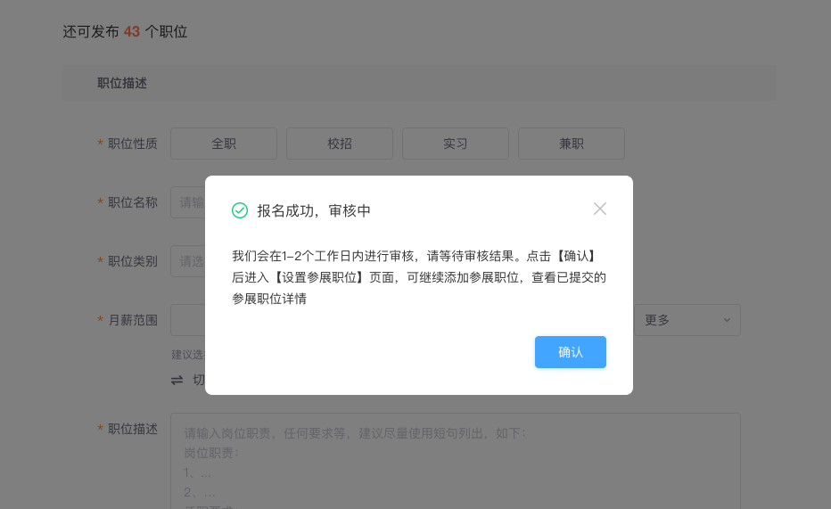 5.发布职位后即为报名完成,您可继续发布剩余参展校招职位,待工作人员审核通过后即可全部展示在招聘会页面