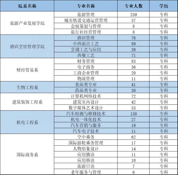 u学院专业设置及毕业生情况:学院现有旅游产业发展学院、酒店烹饪管理学院、财经贸易系、生物工程系、国际商务系、建筑装饰工程系、机电工程7个院系,共计开设40个专业,2020届毕业生共计1309人。
