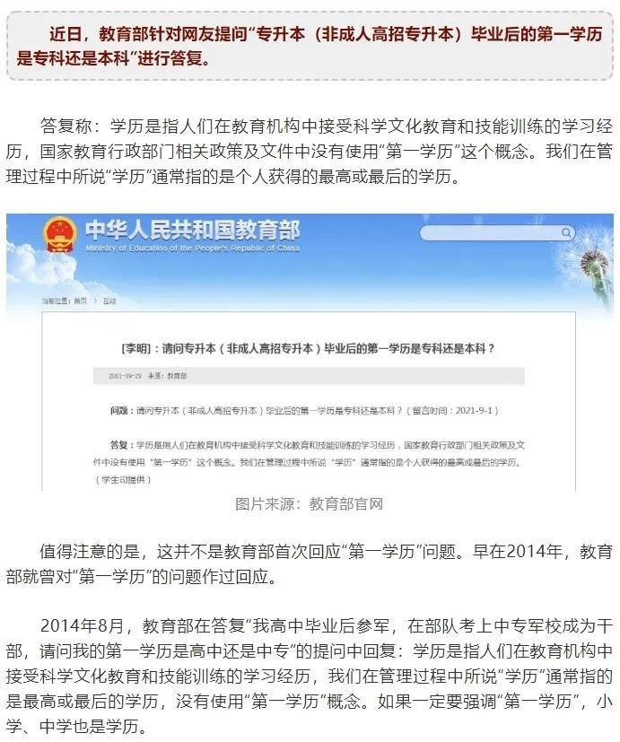 这个问题已经存在多年,从报考专科学校的考生咨询开始,到每一年专升本报名之时,再到毕业求职应聘之际,总会有不绝于耳的声音问着同样的问题:专升本是“第一学历”吗?小编感觉这个问题仿佛已经被盘的都包浆了!小编认为,想要回答这个问题我们不妨从政策应用两个层面入手。从政策层面看,“第一学历”是个伪命题!