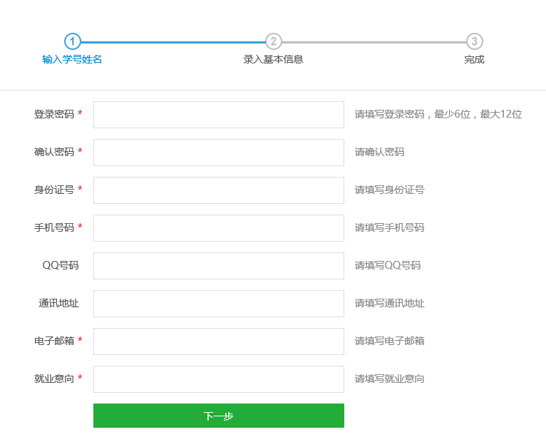 进入注册页面后,依次按要求填入信息,填入的信息要务必确保真实,提交后会自动和数据库信息进行比对,比对不通过请联系学校就业管理部门,比对通过后即注册成功。
