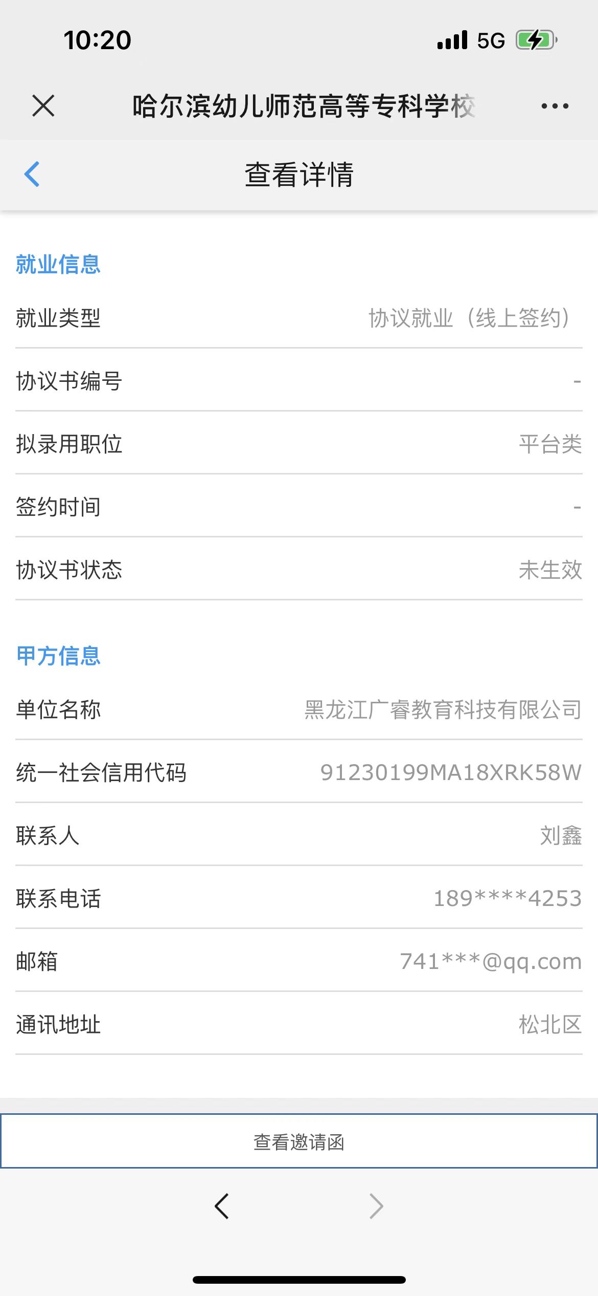 登录哈幼专就业服务平台微信端---主页---我的---输入账号密码----进入签约中心---线上签约---查看邀请函,如下图: