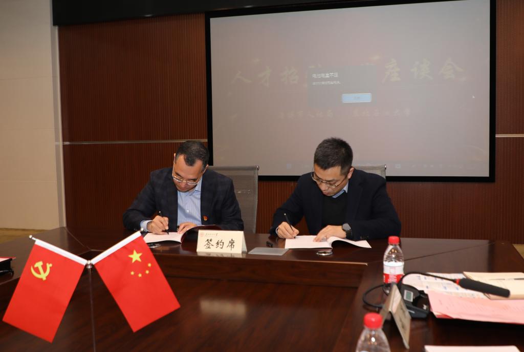 会上,淄博市人社局与我校签署人才引进合作协议书,淄川区人社局与我校举行“人才工作站”揭牌仪式。