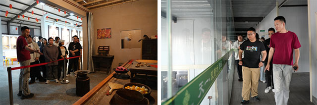 他们的目光如探针般扫描着整个空间:陶坛阵列形成的磅礴视觉节奏、古老酒标上斑驳却韵味独特的字体与图案、不同年代酒瓶的形态演变与材质肌理、乃至灯光下酒液流淌的琥珀光泽…… 这些都是构成玉泉品牌独特视觉叙事的关键元素。