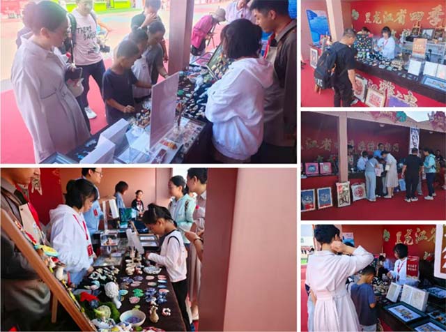 展会现场,三江美院展区人气鼎盛,成为现场瞩目的焦点。学院师生创作的陶瓷、刺绣、剪纸等文创产品,巧妙融合了实用功能与美学价值,既承载着粗犷厚重的尔滨风情,又传递出非遗文化的灵动韵味;而文创冰箱贴、胸章、玩偶及石塑粘土工艺品,则以其精巧的创意与憨态可掬的形象,深受游客喜爱。这些琳琅满目的展品,均源自学校文创大师班与“创意无界·彩绘阿城”产教城融合教学实践活动的教学成果,每一件都凝聚着师生的智慧与心血。