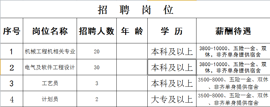 招聘岗位:机械工程及相关专业;电气及软件工程设计、安装测试;工艺员;计划员