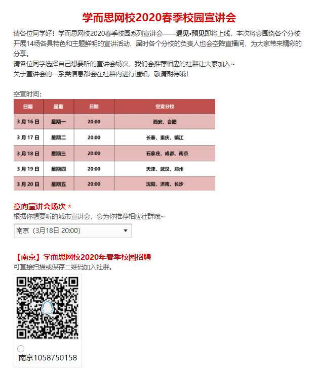 经与学而思网校HR沟通、确认,现将学而思网校2020春季校园云宣讲会信息公布如下,欢迎有意的同学积极参与