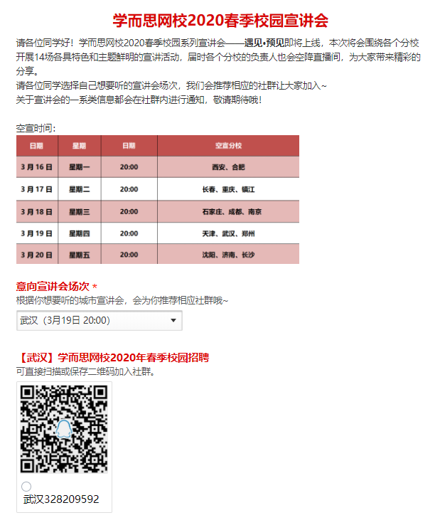 经与学而思网校HR沟通、确认,现将学而思网校2020春季校园云宣讲会信息公布如下,欢迎有意的同学积极参与